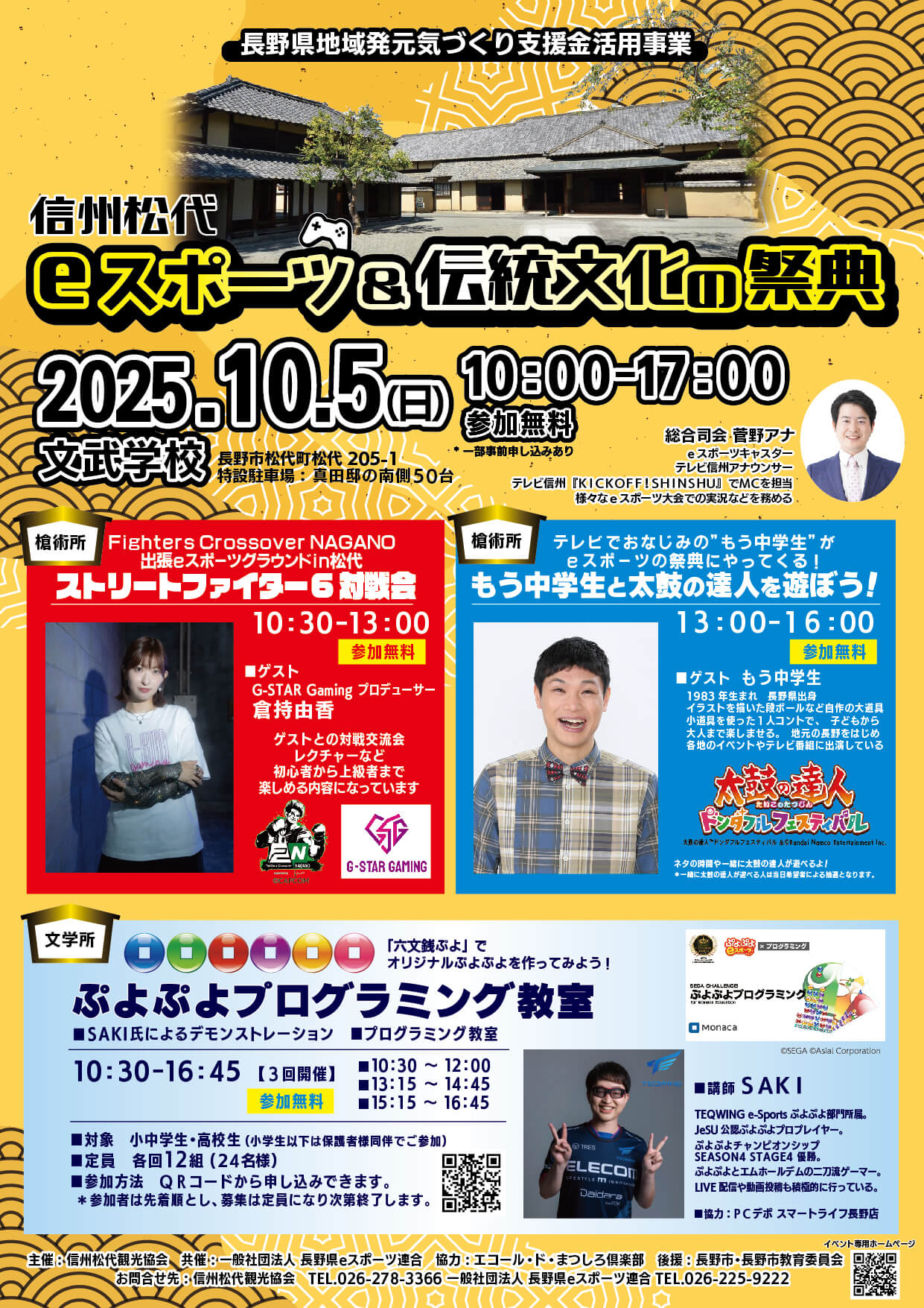 今年も10月5日(日)に、長野市松代町の文武学校にて「信州松代eスポーツ&伝統文化の祭典」を開催いたします。